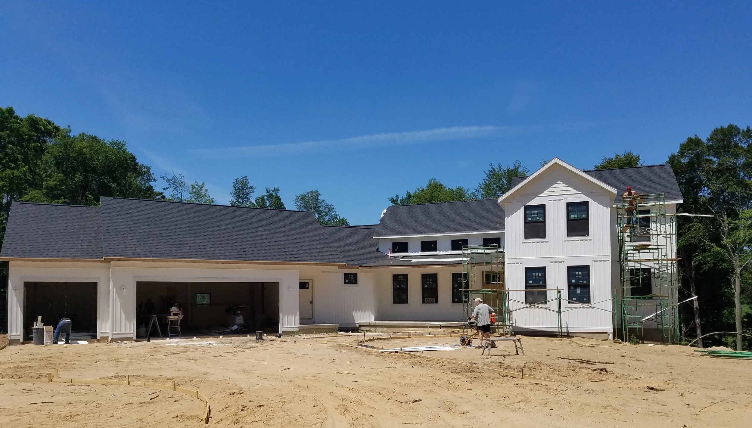 This beauty will soon be home to a wonderful family that will make lots of memories here. What a fun project to be a part of! The first picture displays one of our crews in action. We are the proud installers of CertainTeed’s Landmark Shingles in Moire Black, Metal Roofing in Burnished Slate, and Variform’s Vinyl Siding in Dover White.